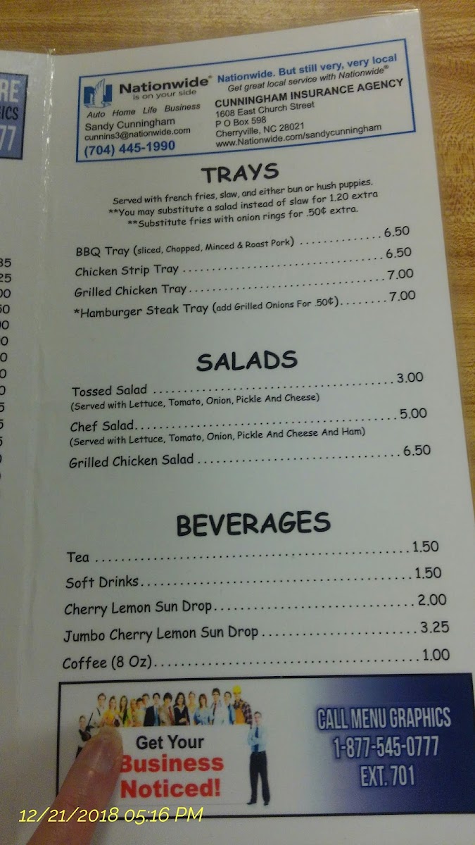 Welcome to Black's Grill, a charming eatery nestled in Cherryville, NC, where comfort food meets homestyle charm. With a menu designed to satisfy every craving, Black's Grill features a fantastic selection of baskets and sandwiches, all at wallet-friendly prices. Choose from classic items like the Cheeseburger and Lotta Fish, or indulge in unique offerings such as the Chuckwagon and Hot Dog. Vegetarian options like the Grilled Cheese and Lotta Grilled Cheese are also available.